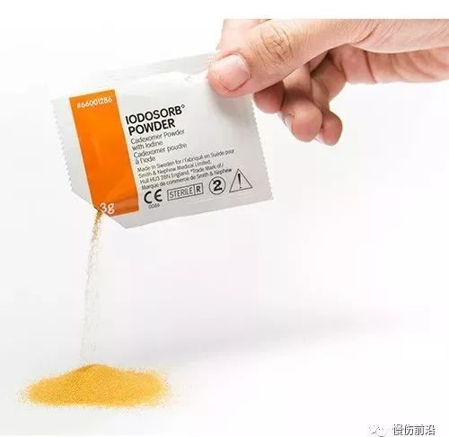 • 整个创面使用卡地姆碘粉:卡地姆碘含有水溶性的改良淀粉聚合物,含0.9%的碘。虽然有含碘膏剂,但粉剂更优,因为可以更好地平衡湿度和便于大范围使用,包括溃疡面和完整皮肤;(注意:对碘过敏、孕妇和正在哺乳的妇女不可使用)