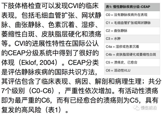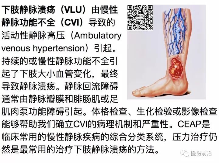 CVI呈进展性变化,有多种不同的临床表现。压力治疗可以降低静脉高压,改善静脉回流和血流动力学,仍然是治疗下肢静脉溃疡的金标准。