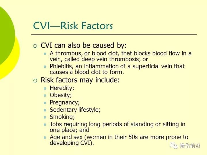 CVI风险因素包括年龄、肥胖、家族史、怀孕、静脉炎和腿部损伤或外科手术史。致使个体长时间站立或坐立的因素也会对CVI的发生产生影响(Eberhardt, 2014; Wittens, 2015; Franks, 2016)。