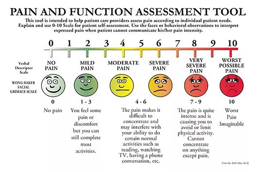 医护人员的积极介入对于理解患者疼痛体验至关重要,因为我们发现这种疼痛常常很难描述得清楚。给患者一些描述性词语来选择和使用合适的疼痛衡量工具往往是有帮助的。没有一种疼痛衡量评分适合于所有病人;且工具的选择要依据患者的个体需求。然而,一旦选定工具,接下来的评估须使用同一评分。疼痛水平的改变可能表明需要重新考虑镇痛剂的选择和时机、和/或其他疼痛治疗措施(WUWHS 2004)。所有的评估应妥善记录以确保有效沟通和保持患者治疗的延续性。疼痛评估的关键元素包括:疼痛类型(伤害感受性、神经性或混合性)、持续时间、严重性、对患者的影响、缓解程度(镇痛后评分)、识别治疗相关的副反应以减少其影响。