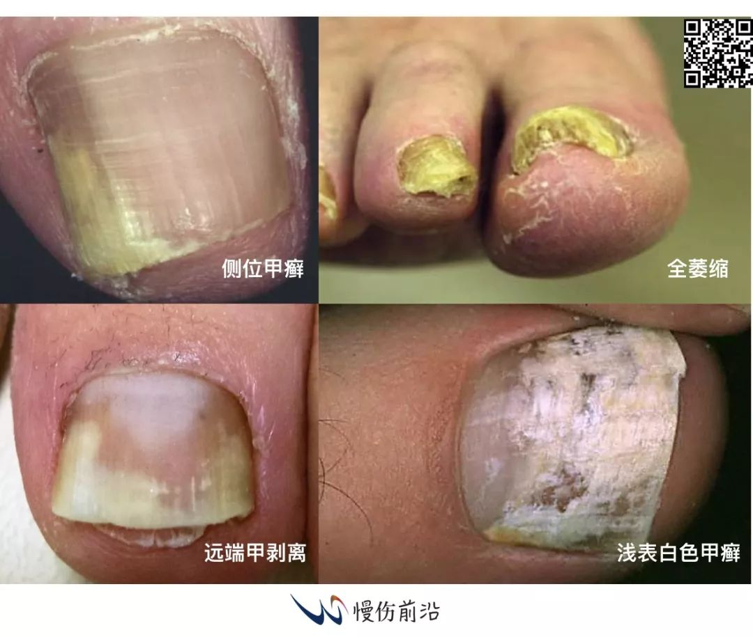 一些常见的表现包括侧位甲癣(白色或黄色不透明的条纹出现在趾甲一侧)、远端甲剥离和角化过度(趾甲远端下面出现脱屑,趾甲变色、不透明和增厚,最终导致趾甲掀起)、浅表白色甲癣(小的白色易剥脱斑片和凹陷出现在甲板上,趾甲变得粗躁和易于脱屑)、全萎缩型灰趾甲(趾甲完全被破坏)。脚癣表现为足部出现瘙痒、红肿和发炎区域,常位于脚趾间、脚底(小泡型)、或在足的内侧和外侧。