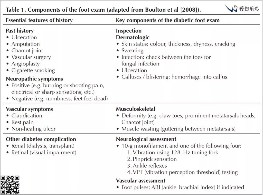 糖足变化是一些因素的共同结果,例如周围神经病变、血管病变和足畸形。这些作用因素的评估和治疗对于优化糖足并发症的预防和治疗是必需的(Boulton 2008; Bakker 2011),这需要进行综合足部检查、风险评估和与患者就其足部状况进行清晰的沟通(表1)。