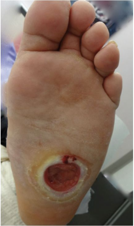 运动神经亦受到影响,传导速度减慢,足部固有肌肉的动作电位降低,终导致足部内在肌肉的废用和衰弱、及接下来的畸形(爪形/锤状趾)。足畸形造成足底压力的异常分布、反复创伤和继发足部溃疡。这种足溃疡的形成常是继发感染、局部组织坏死和下肢截肢的第一步。