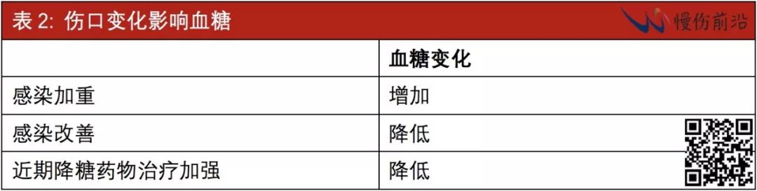 伤口的稳定性对血糖具有影响(表2)。如果伤口快速变化,HbA1c降无法准确反映病人血糖水平,当患者具备能力和意愿针对SMBG对血糖予以管理时,应鼓励SMBG。