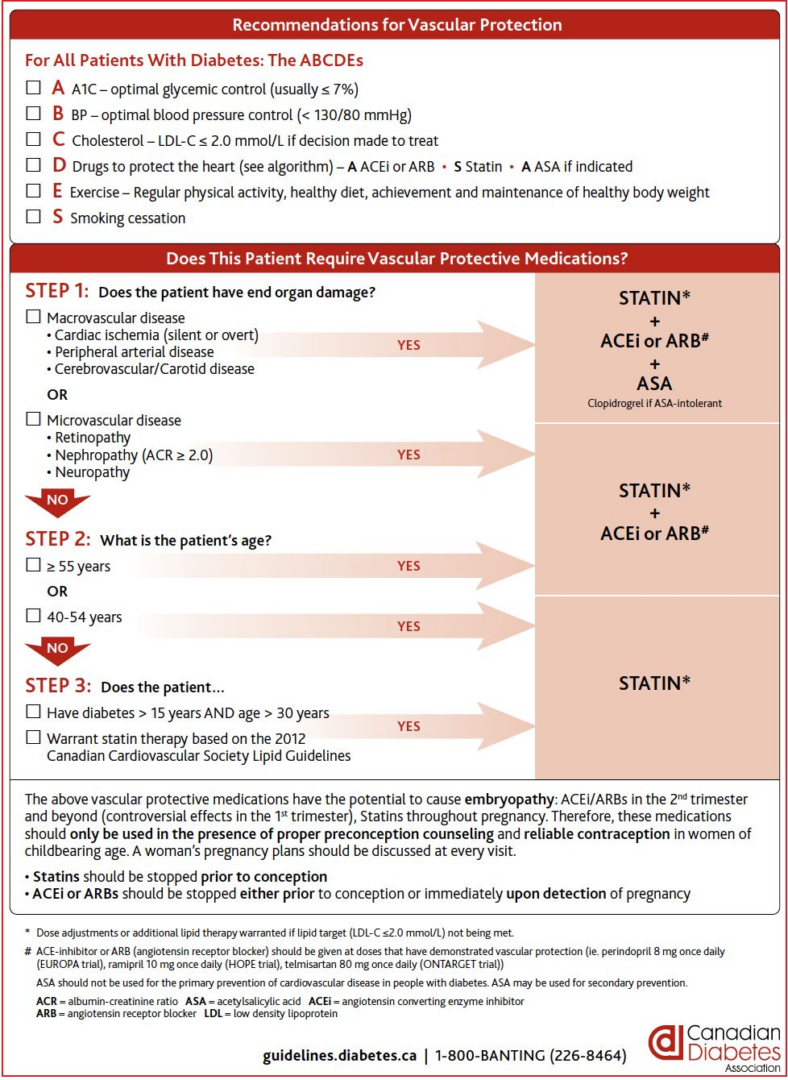 加拿大糖尿病学会制定了ABCDES规范,作为糖尿病人循证血管保护的指南(图2)。A为A1c-优化血糖控制;B为血压-优化血糖控制;C为胆固醇;D为药物(保护心脏);E为锻炼;S为戒烟。
