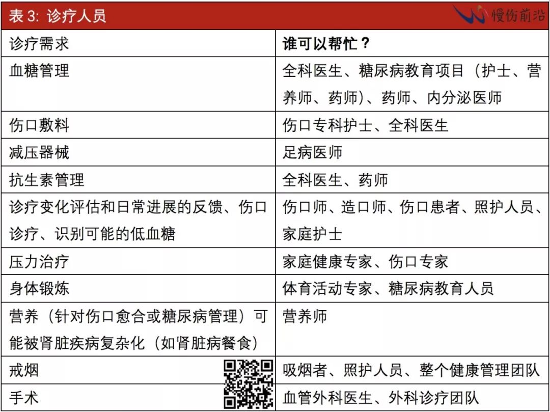 对DFU患者血糖的管理非常复杂,主要是因为存在多种合并症和伤口的快速变化。人们普遍认为患者的积极参与和对病情的充分了解,加上多学科团队的支持,可以显著改善临床预后。团队成员之间的有效沟通对于治疗的有效很重要。鉴于患者需求的多样性,诊疗团队可构成可能不同。表3所列为诊疗团队有效构成的举例。